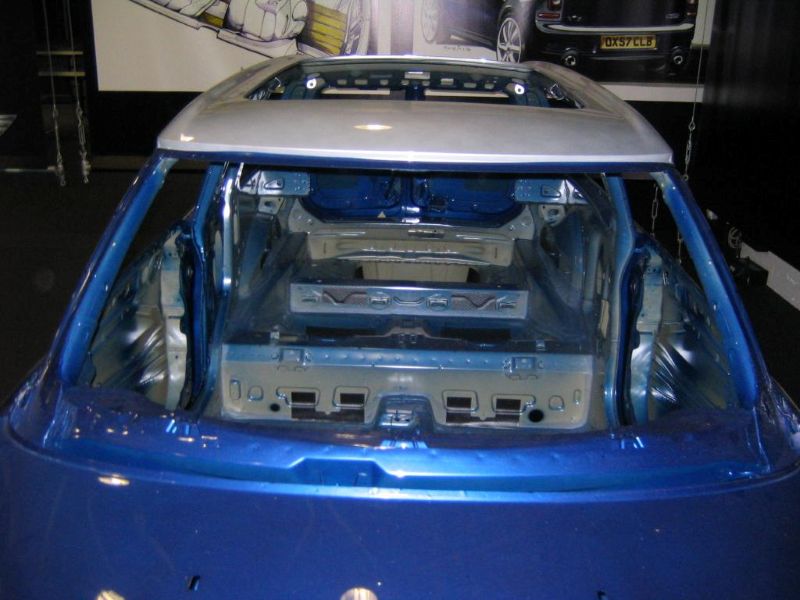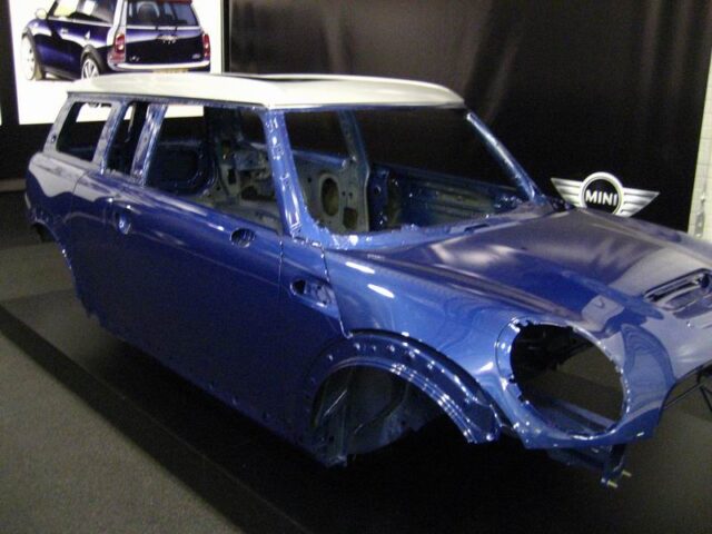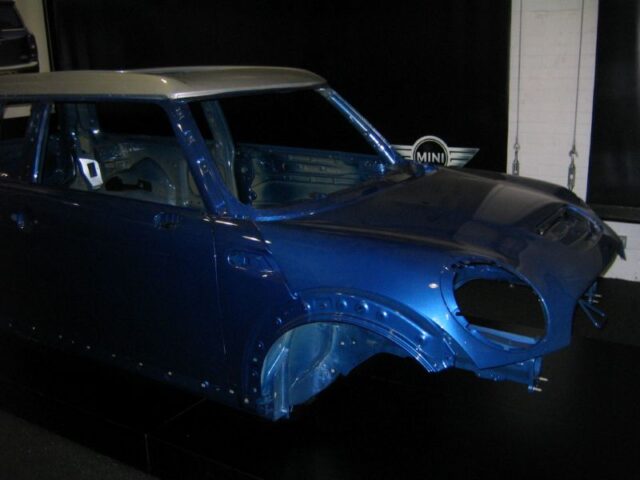 Todo va colgado o desplazándose por el techo de la nave. Los robots de brazo hiperarticulado cumplen su función con precisión milimétrica. Entendemos ahora lo de las gafas y las batas…saltan chispas por todas partes. En un ratín…zas, un clubman con su techo para techo de cristal…detras…zas, un R56 sin techo de cristal…cada pieza soldada y/o pegada con silicona. Increíble. «Es pa verlo».